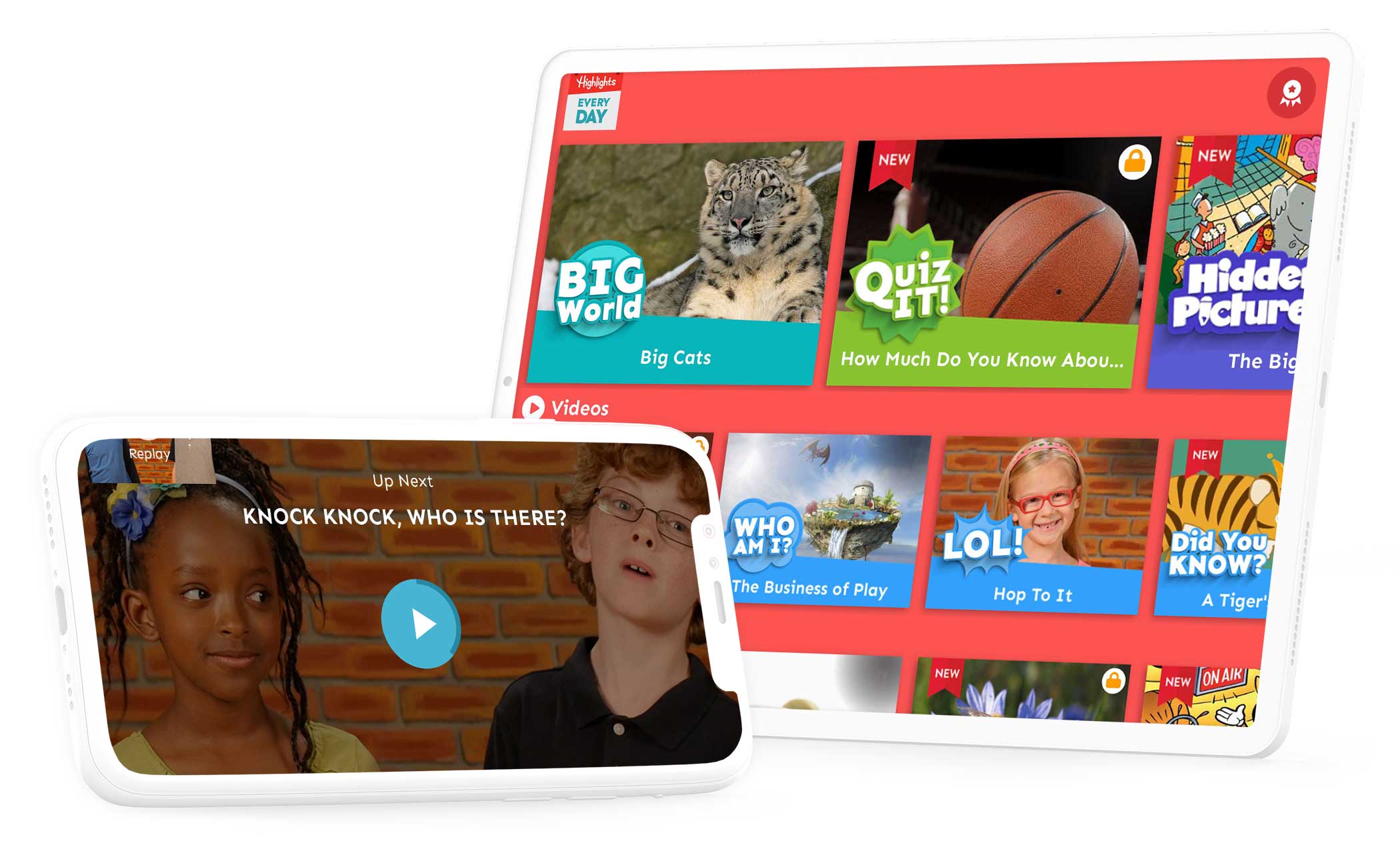 La idea principal era re imaginar una experiencia digital para Highlights for Children. Enfocado en niños entre 4 y 10 años, el contenido se divide en videos, puzzles, joke reels, learning clips, mazes, etc.