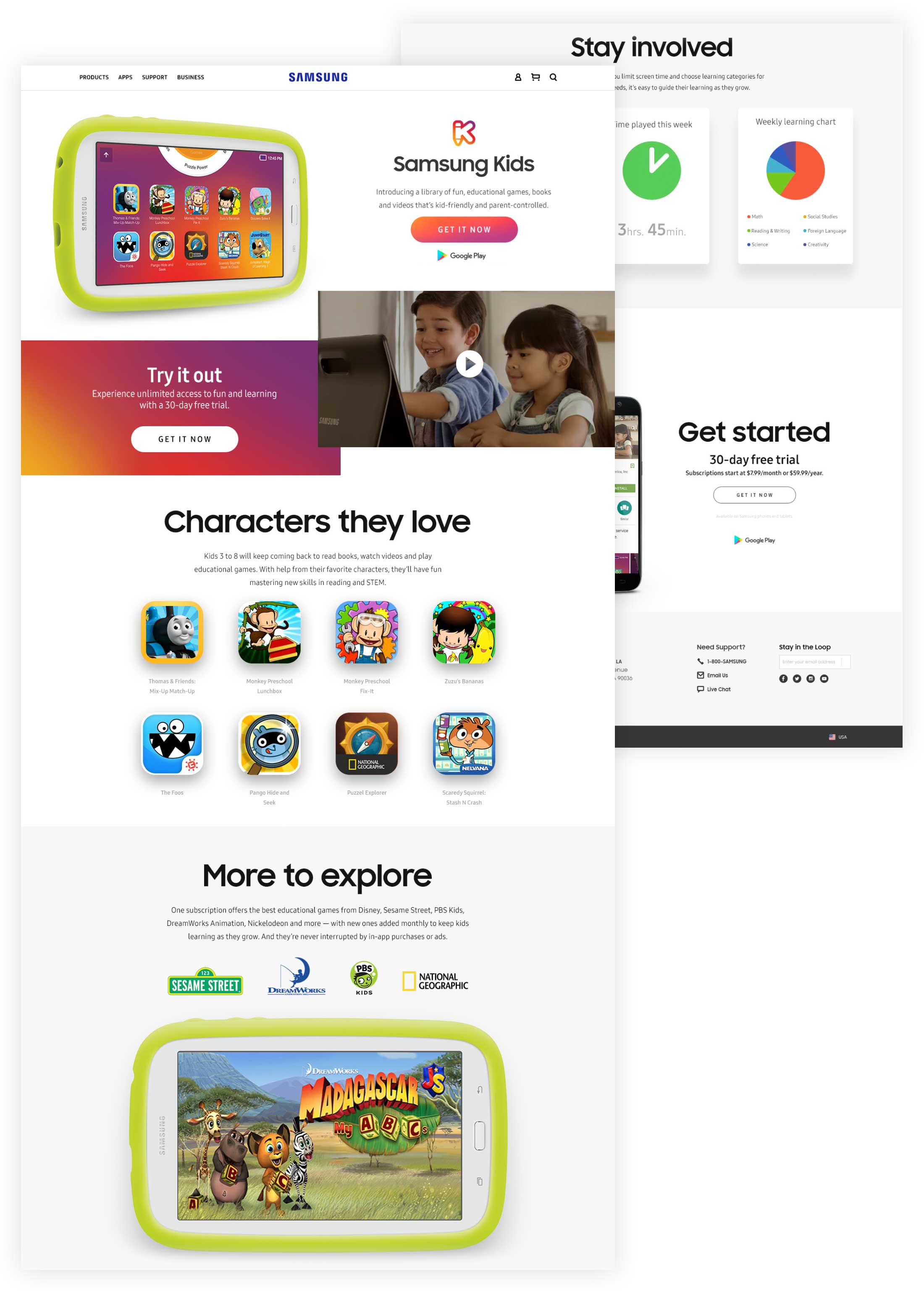 Mis funciones en este proyecto también fueron diseñar el concepto original, planeamiento de la estructura, programación en html5 y testeo en múltiples navegadores y dispositivos del sitio web para Samsung Kids.